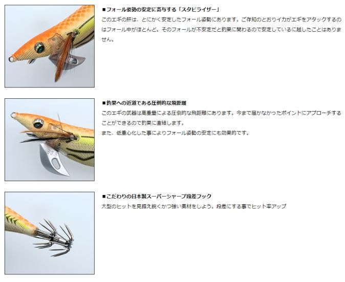 ■山田ヒロヒトが考える釣る為のエギを具現化。スタビライザーと低重心設計により揺ぎない安定感を実現。飛距離、フォールの安定感、強波動で今まで反応しなかったイカを狙い打つ。フォールスピードは各サイズ約6秒/mとしシャローはもちろん春の藻場攻略に最適な設定。ラトル仕様のハイアピールモデル。