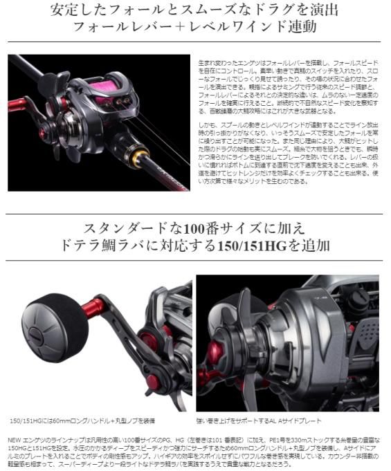 進化を止めない鯛ラバリール・エンゲツがさらなるスペックをまとってリニューアル。マイクロモジュールギア、X-SHIPがもたらす滑らかかつ強力な巻き上げはそのままに、レベルワインド連動スプール、フォールレバーを搭載して安定したフォールを演出。堅牢さを増したアルミのHAGANEボディが大鯛との力勝負を制します。アイテムは汎用性の高い100番に加え、ドテラ鯛ラバを見据えた150番をラインナップ。幅広いフィールドと戦略に応える鯛ラバリールの誕生です。