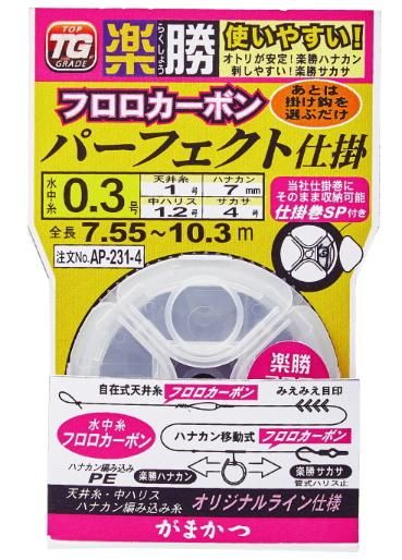 仕掛をオールフロロカーボンとし、自在式天井糸に、水中糸を4.5m、中ハリスと水中糸をチチワで接続するシンプルな定番仕掛です。ハナカンは「楽勝ハナカン」、サカサは「楽勝サカサ」を採用。扱いやすさ抜群です。