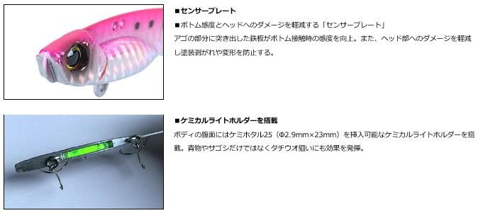 ショア回遊魚をターゲットにした専用設計。ボディの腹面にはルミカ社のケミホタル25(φ2.9mm×23mm)を挿入可能なケミカルライトホルダーを搭載。青物やサゴシ、シーバスだけではなくタチウオ狙いにも効果を発揮。また、ボディ先端には「センサープレート」を搭載。アゴの部分に突き出した鉄板が感度の向上とヘッド部へのダメージ軽減に寄与する。