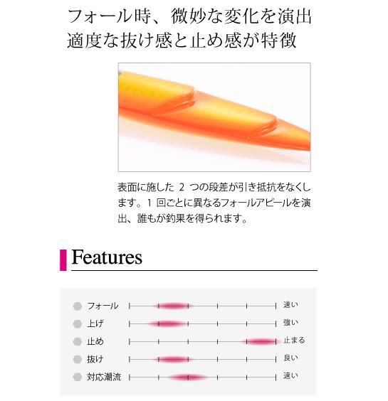 初心者におすすめした、扱いやすいショートジグです。ジグ自体がオートマティックに動き、フォール時イレギュラーな動きを演出します。また軽い力で即座にスライドする優れた操作性も魅力で、表面に刻んだ段が引き重り感を軽減します。