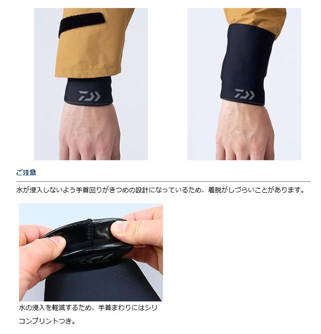 水が浸入しないよう手首回りがきつめの設計になっているため、着脱がしづらいことがあります。