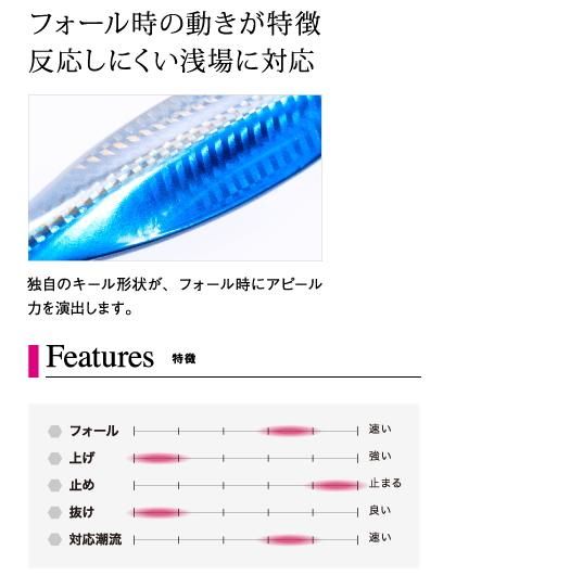 フォールに特化したショートジグです。非対称度の大きいシルエットで、裏面のキール形状によりフォール時ターゲットに力強くアピールします。コンパクトなフォルムで二枚潮にも影響されにくく、繊細なアクションにも機敏に反応し容易にステイを維持できます。また、上げ・下げ共にソフトなショートアクションに追従。フォールにしか反応しない状況、あるいは極端に浅い水深で魚からのコンタクトを取りたい時にぜひ使ってみてください。