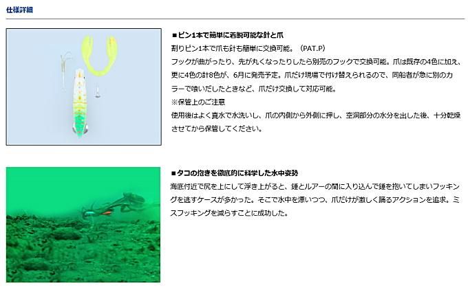 マダクは、水中で水平の状態に近い絶妙なバランスで浮き、爪は振り上げられた状態で大きく動くのでとても高いアピール力を発揮する。フックは、ファインワイヤーでありながら、しっかりタコの身に食い込む形状を追求し、万が一根掛かりした場合でも、ゆっくり引けば伸びて回収可能な焼き入れ硬度を追求している。これらは、昨年明石で問題になった遊漁における釣具の海中投棄に関する件についても、いち早く現地の遊漁船、漁業者との連携をとってそれに合致する製品つくりに沿って完成させたタコルアーである。多くの実験と検証。乗りのメカニズムを高い次元で解明し完成させたタコルアー。