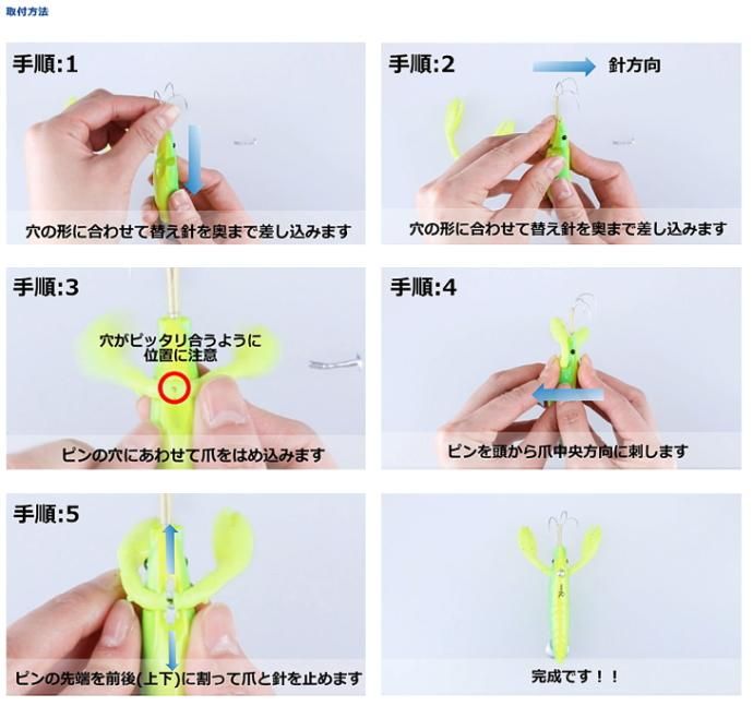マダクは、ワーム素材でできた爪とファインワイヤーで作られた専用半傘タイプカエシ無しトリプルフックがボディに配されており、1本のアルミ製割りピンで止められている。