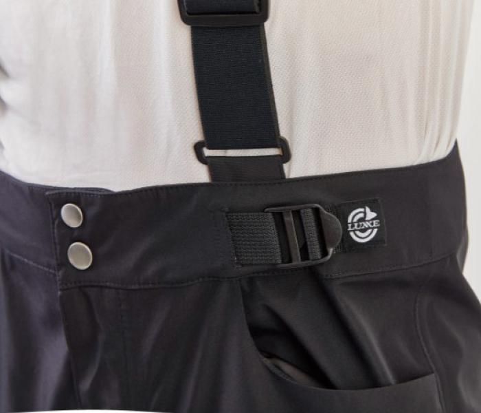 ● LUXXE 独自の防水透湿3レイヤー素材●耐水圧20,000mm、透湿性5,000g/m²・24hrs ●止水性の高いYKKのAquaGuardメインファスナー●長さ調節可能なウエストベルト●着脱可能サスペンダー●スッキリとしたシルエット