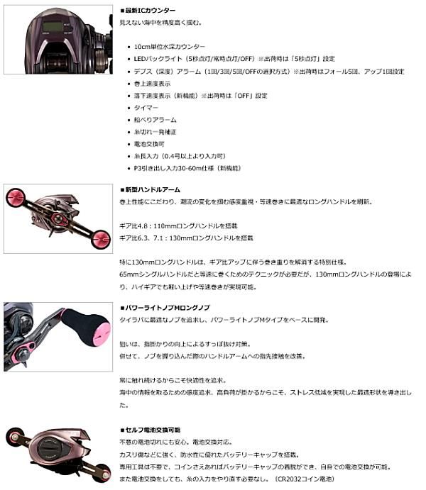 高い基本性能が永く続くことを目指し、全ての基本性能の水準を大幅に高めた次世代ベイトテクノロジー「HYPERDRIVE DESIGN」を搭載。巻き主体となるタイラバゲームにおいて、その効果を遺憾なく発揮する。潮流の変化を掴む感度重視や等速巻きの狙いから、ギア比展開を強化。更に軽い巻上げでアングラーをサポートする130mmクランクハンドルを搭載(150P、PLは110mm)。ロングハンドルの効果は、魚とのファイトはもちろん、ルアー回収の際に誰もが実感できるだろう。ICカウンターには、巻上速度表示に加え落下速度表示、デプスアラーム機能を新たに搭載。ヒットシーン再現も可能に。まさにタイラバへのこだわりを凝縮した珠玉の専用機。
