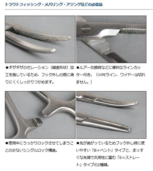 先が曲がっているためフック外し時に使いやすい「B=ベント」タイプと、まっすぐな先端で汎用性に富む「S=ストレート」タイプの2種類。