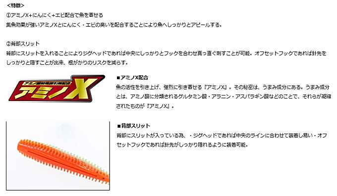 ベースとなっている機種はカサゴ倶楽部ガブリカーリーであるため、集魚効果を高めるアミノXと臭い、背中部分のスリットが入っている等の特徴は引き継いでいる。