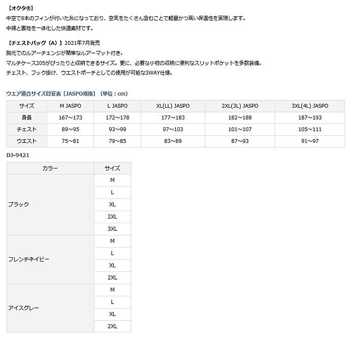 撥水のウィンドジャケットで肌寒い季節にぴったり。裏地には軽くて暖かい中空の起毛素材オクタ(R)を採用。背面とフードにはベンチレーションが付いており、風を受けても膨らみにくい仕様。ポケットフラップ裏にはループが付いており、別売りチェストバッグ(A)と連結することで、手ぶらで釣行可能。ループはピンオンリール等を付ける際にも便利。胸ポケットはファスナー付きで、小物の収納に便利。