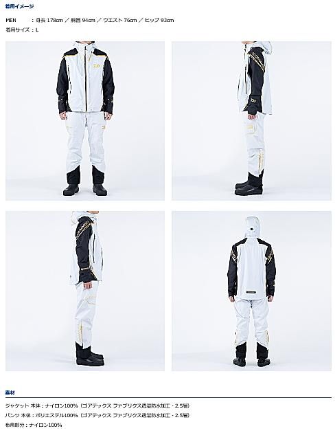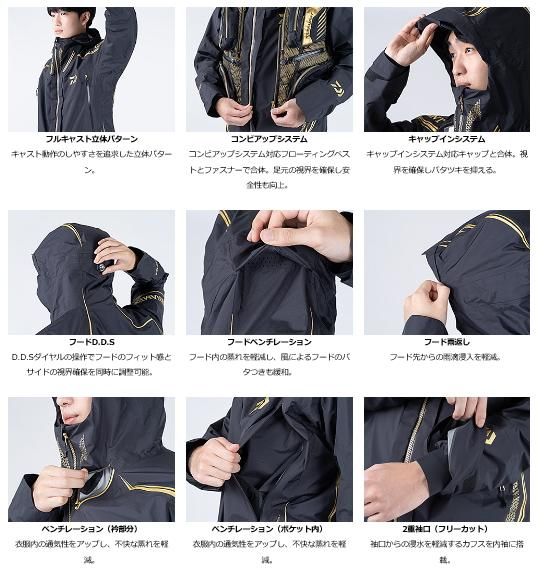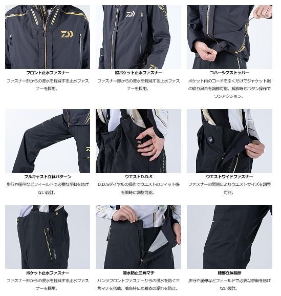 本体生地にはしなやかな風合いを持つGORE-TEXパックライト(R)プラス生地を使用。フードには風によるバタつきと蒸れを軽減するフードベンチレーションと雨返し機能、キャップインシステムを搭載。D.D.Sダイヤルの搭載により、フード間口の絞り具合とサイドの視界を同時に調節可能。襟元と脇ポケット内にはベンチレーション機能を装備し、ファスナーの開放で衣服内の蒸れを放出することが可能。磯用フローティングベストと一体化可能なコンビアップファスナーを搭載。フィット感の調整を容易にするCohaercive(R)システムを裾部分に搭載。パンツには、着脱可能サスペンダーとパンツサイドループ、ウエストD.D.Sを搭載。各ポケットには軽量止水ファスナーを採用。パンツ裾部には補強素材を使用。
