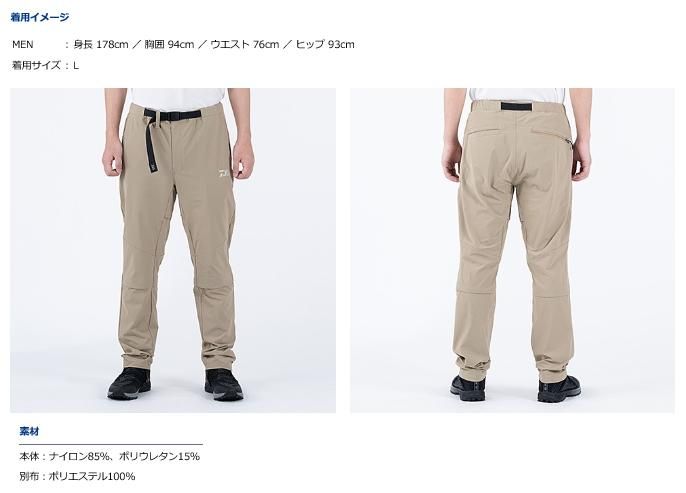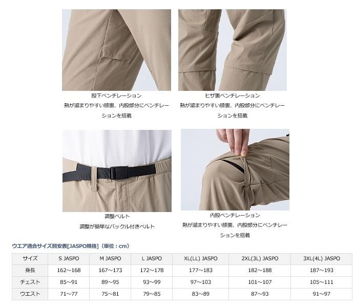 ストレッチ性に優れた撥水素材を採用。ベンチレーションを股下、膝前、膝裏に搭載することで、空気の流れを作り、快適な衣服内環境を提供。バックル付きベルトを採用。収納に便利なファスナー付きポケットを搭載。股下のマチがアクティブな動きを実現。