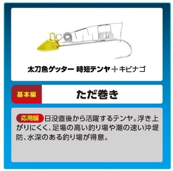 ドジョウではなく、キビナゴを取り付けるために開発した太刀魚ゲッター・時短テンヤ。ウキ釣りの餌として一般的に使われているキビナゴを、あえてテンヤと組み合わせることで、今までになかった非常に攻撃的な釣りが可能になります。「夕方から回遊してくる太刀魚を手早く探って釣るのが得意なルアー」と、「夜、居るのに喰いが落ちた太刀魚をじっくり釣るのが得意なエサ」それぞれの特性を生かし、お互いの長所をミックスした新アイテム、それが太刀魚ゲッターです。