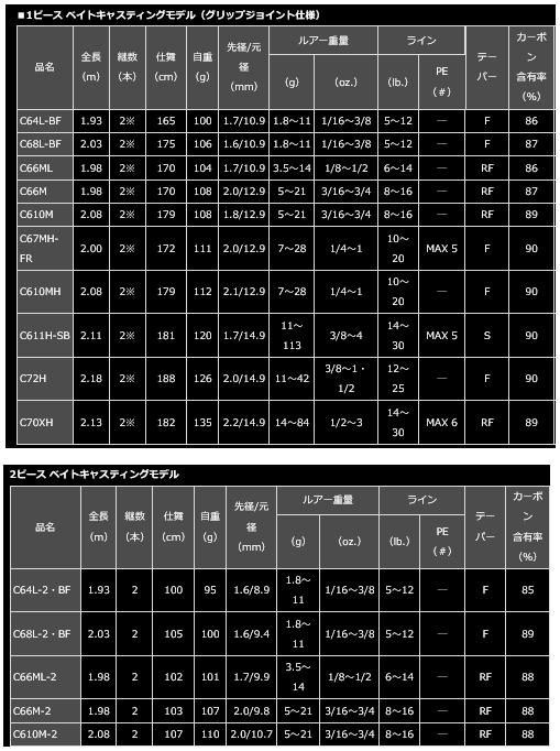 ベイトとスピニングの表記法を変更。「ベイト:C、スピニング:S」とし、2PCロッドは長さの後ろに「-2」