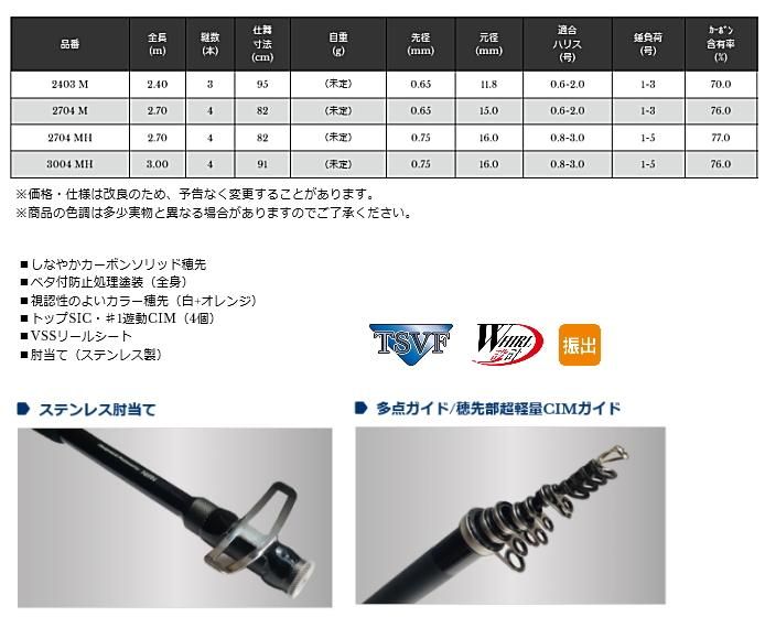 ストレスなくポイント移動ができる、振出仕様のヘチ専用ロッド。視認性の高いカラー穂先に、全身ベタ付き防止塗装を施し、穂先部にはSICトップガイドと軽量カーボンフレームCIMガイドを搭載した多点ガイド仕様。糸がらみのトラブルやラインのベタ付きを軽減し、穂先部の軽量CIMガイドにより感度もアップ。握り易いEVAグリップと、やり取り時に安定感が増すステンレス製肘当てを搭載した本格モデル調子はM/MHの2調子で、240M/270Mと270MH/300MHの4アイテムのラインアップとなっております。