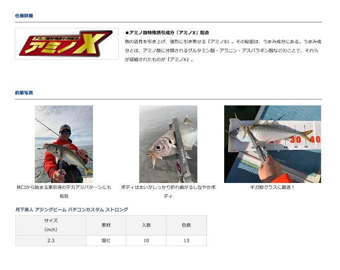 アミノ酸特殊誘引剤「アミノX」とシュリンプパウダーをふんだんに配合し集魚力が鍵になるバチコンアジングに最適な仕様。