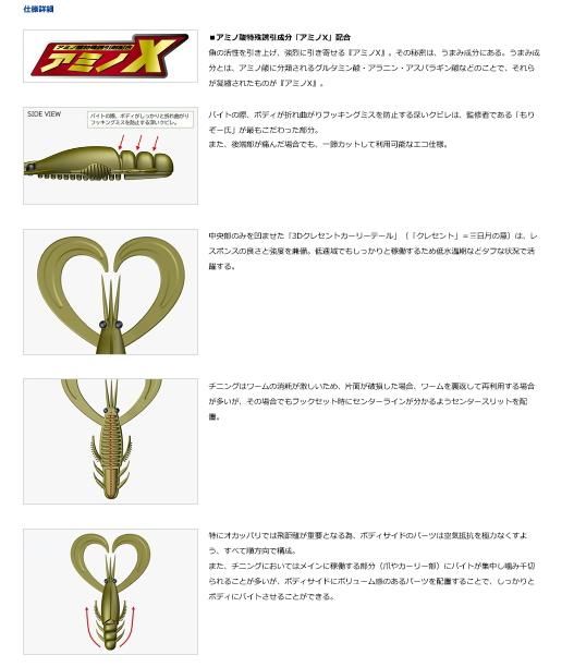 また、当社独自のテクノロジー「アミノX」とエビ粉をボディ素材に配合。集魚成分もフッキングに持ち込む強いバイトを引き出すための重要な役割を果たしている。