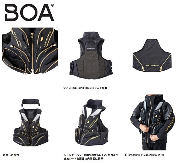 魚とのファイトを左右する機動性。フローティングベストにはこの機動性を妨げないための高いフィット感と軽さが求められる。リミテッドプロ フローティングベストは、既存製品と比べ10%の軽量に成功。着脱ぎしやすくまた瞬時にフィット感を調整可能なBOAシステムも搭載した。肩の内外面に特殊な滑り止めシートを配置することで、ショルダーパッドの横ズレも抑制している。