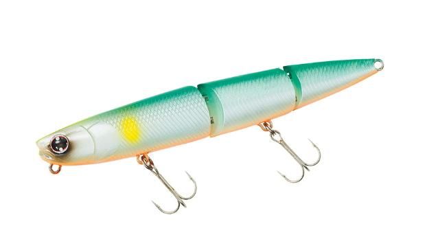 固定重心ながら安定した飛行姿勢を実現。違和感無くスムーズにうねる2点支持ジョイント構造。水面付近を艶かしい連続引き波で誘えるウエイクベイト120F(120mm/15.5g)と水中をスネークスラローム+イレギュラースライドで誘えるシンキングペンシル120S(120mm20g)の2タイプ。テール先端のアイはレスポンス重視で通常は何も付けていませんが、フェザーを付けるとよりワイドかつスローなアピールアクションに、トレブルフックを付けてアクションをタイト且つフッキング率を上げたり、ブレードチューン等アレンジが可能。