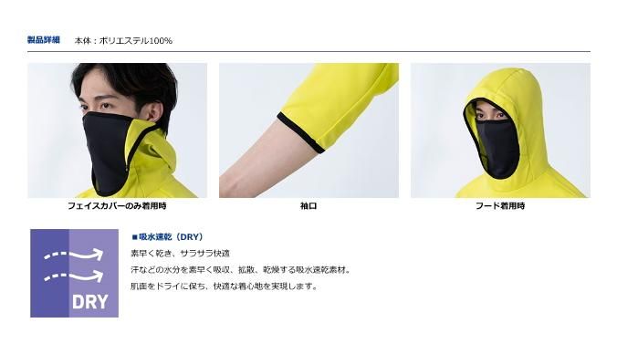 少し厚手のゲームシャツ。ネック/フェイスカバー用のフリース付きで肌寒い時に便利。袖口は袖捲りでき、フードは風で飛ばされにくいバインダー仕様。