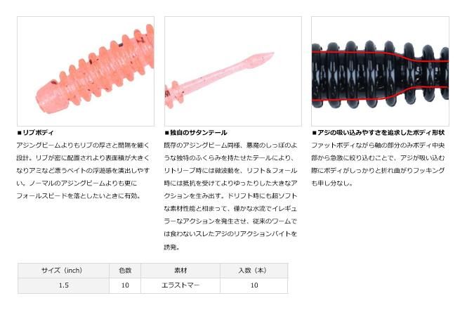 ボディが太くなった分、水をつかみやすく、ボディのリブと相まって強い水流抵抗を発生。潮の流れに乗せてドリフトする際やノーマルのアジングビームよりもさらにフォールスピードを落としたいときにオススメ。また、タダ巻きでも適度な引き抵抗を感じることができるためアミなどの浮遊ベイトをイミテートしやすい。ボディのコア部には高濃度に凝縮した集魚成分を配合。味とニオイの持続性が大幅アップした。