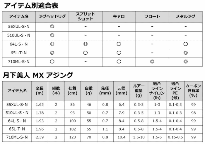 アジングロッドのハイスタンダードモデル、月下美人MX。スペックはさらに研きがかかり、外観はさらに煌びやかに。上位モデルと肉薄する軽さと操作性を手に入れ、ルアー操作性がさらに自由になった。その要となるのは徹底的に作りこんだブランク。ベリーからバットセクションにかけての繋がりを見直したことで、キャストしやすいルアーウエイトの幅が拡大。ティップにハードソリッドティップや、ハイレスポンスのチューブラーティップを搭載したことで、感度にも鋭敏になっている。さらに遠くへアプローチして自在にアジを誘惑。アタリを鮮明に感知して即座に掛けのモーションに移る。突き詰めたのはダイレクト感。今宵、さらに楽しいアジングゲームの幕開けだ。