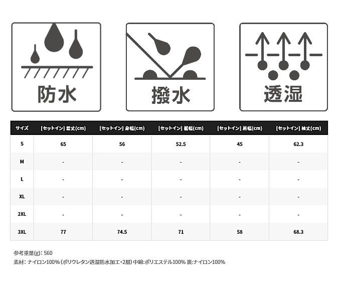 素材: ナイロン100%(ポリウレタン透湿防水加工・2層)中綿:ポリエステル100% 裏:ナイロン100%