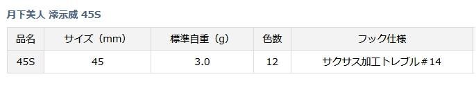 発売以来、数々のドラマを作り続けてきた澪示威(レイジー)の遺伝子を余すことなくコンパクトボディに受け継いだ「45S」。45mmという大きすぎず小さすぎない絶妙サイズでターゲットを魅了する。派手なアクションを嫌うメバルの性質を考慮し、ボディの振り幅を抑える反面ローリングを向上させ、明滅効果による視覚的なアピールを高めたため、小型でスレンダーなボディながら存在感は十分。また高バランス設計のボディはスイミング時にはデッドスローでもしっかりとアクションし、フォール時にはローリングフォールでナチュラルに誘い続ける。スリム&コンパクトシルエットながら自重は3.0gで飛距離もしっかり確保する徹底した低重心により、こだわりのレンジキープ力、アクションを演出。荒天時でもストレスなく飛距離を稼ぐことができ、軽量ルアーでは太刀打ち出来ないような状況でも威力を発揮する。サクサス2フック仕様でフックアップ性能も申し分無し。