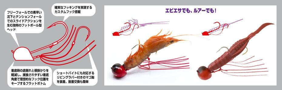 ソフトルアーだけでなく、エビエサの使用も視野に入れた次世代型ジグヘッド「オーバルテンヤ」シリーズに、新たに「TGオーバルテンヤ」が追加されます。コンパクトながら高い比重とフォールスピード、底取り感度のよさを実現するためにタングステン素材を使用。さらにソフトルアーのシェイプを極力損なわずに、ガッチリとホールドできる特殊キーパーを採用しています。独特なフットボール型のヘッドシェイプは、フリーフォールではスピーディーに深場へ到達し、テンションフォールではしっかりと水を受け独特のスライディングアクションで誘います。着底時は魚に違和感を与えるヘッドの底倒れを防ぎ、根がかり軽減にも大きく貢献。また捕食しやすい着底角度で、フックポジションも理想的な位置をキープするのでフッキングも高確率。マゴ針用のアイにリビングラバー付きのマゴ針を装着しているのでショートバイトにも対応し、また簡単に脱着交換も可能。エビエサに替わる究極のエビ系ソフトルアーとして開発された「エコギア アクアスイムシュリンプ」との相性は抜群です。