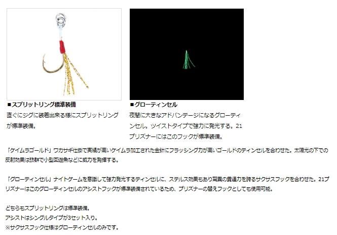 小型のメタルジグを使用するこれらの釣りでは、派手なアシストフックを付けることでアピール効果が飛躍的に上がる。アジ・メバルはもちろん、カサゴやソイなどの根魚やメッキやカマス、小型青物全般に効く。