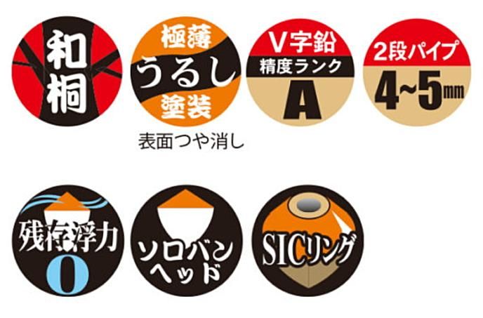 松山・匠は喰い渋った状況でも違和感を与えず、シビアなアタリを伝えるためにシェイプアップされた細身ボディが採用されたことで繊細なアタリを釣り人に伝え、ターゲットとなる魚を確実に掛ける事に重きをおかれた感度重視の松田ウキです。その特有の形状のイエローグリーンのヘッド構造と朱の塗装が施されたトップによって抜群の視認性をもたらし、馴染んだ仕掛けの方向や本層の潮の流れを的確に釣り人に伝達します。細身のシェイプボディで特殊つや消し塗装仕様ですが塗装工程、低重心2段パイプ、Aランクの最高V字鉛など松山シリーズだけに許されたトップクラスの機能仕様。M・L・LLの3サイズ展開ですが、それぞれに最適な自重やフォルムが設定された専用設計となっています。