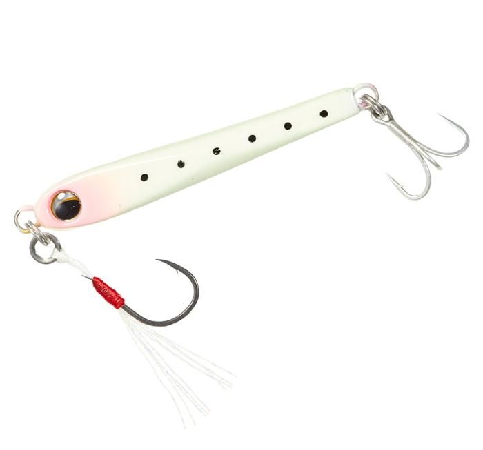メバル、アジのみならずカサゴやメッキ、カマス、ショゴなどの小型回遊魚も狙える万能ジグ「プリズナー」が、SaqSasアシストフックに強力発光グローティンセルをまとってリニューアル。