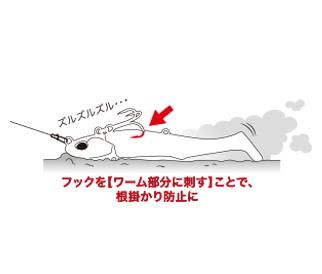 最大の特徴はフックアイを腹側に1箇所と背中側に2箇所設けてあります。ボトムを攻める場合は背中のアイを選択することによりボトムをダイレクトに攻めることが可能。3インチコンパクトボディサイドにはフィンを設置。これはテールの動きから連動発生するボディのロールアクションを抑える役割とフォール時間を長く取れるスライドフォールが可能となり、フォール中のバイトチャンスを増やすことが出来るようになった。ヘッド形状はハウルヘッドに比べ扁平形状となっているため、ハウルよりもスローにリトリーブすることが可能となっている。マゴチに効果的なリフト&フォールではヘッド+フィンが抵抗となり綺麗なカーブフォールでアピールしてくれます。