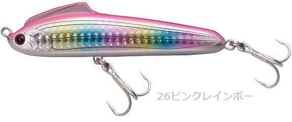 スローリトリーブではナチュラルなアクション。ヘビーウエイトと背中のフィンにより、ハイスピードにも対応し、ダートを伴うウォブリングアクションで強烈にアピールします。サーフの引き波も泳ぎきり、青物ゲームでの早巻きもOK。貫通ワイヤー採用で強度も万全で飛距離も抜群の扱いやすいシンキングペンシルです。