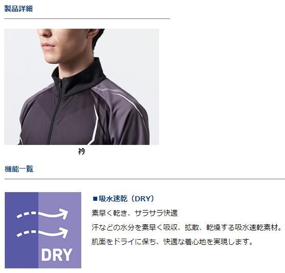 吸水速乾性、UVカット機能、ストレッチ性を兼ね備え、発汗時にもウエアが肌に密着し難く、ドライ感をキープする快適素材。