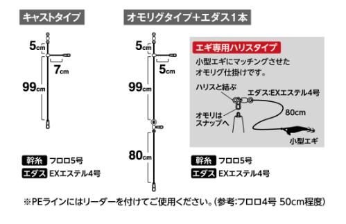 ロングセラーとなったセフィアアシストリーダーに新たにキャスティングタイプが追加になりました。オモリグ仕掛けだけがキャストすると思われていますが、そもそもキャストしてイカを探るのはオモリグの専売特許ではありません。メタルに反応するイカ、ドロッパーに反応するイカ、これらにしっかり対応するために全長を短くし、キャスト時の取り回しを重視しました。