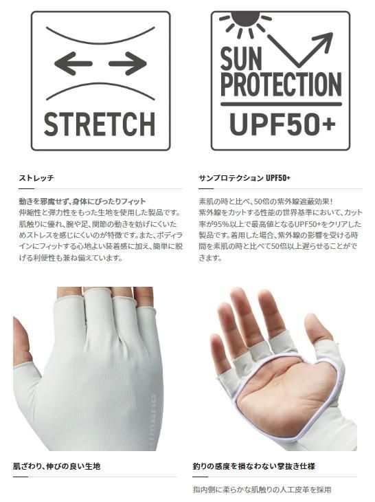 サンプロテクション生地を採用した日焼け対策グローブ。掌抜き、5本指抜き仕様のナチュラルな装着感で紫外線から肌を守ります。肘上まで保護するロング仕様で半袖ウエアとコーディネート。