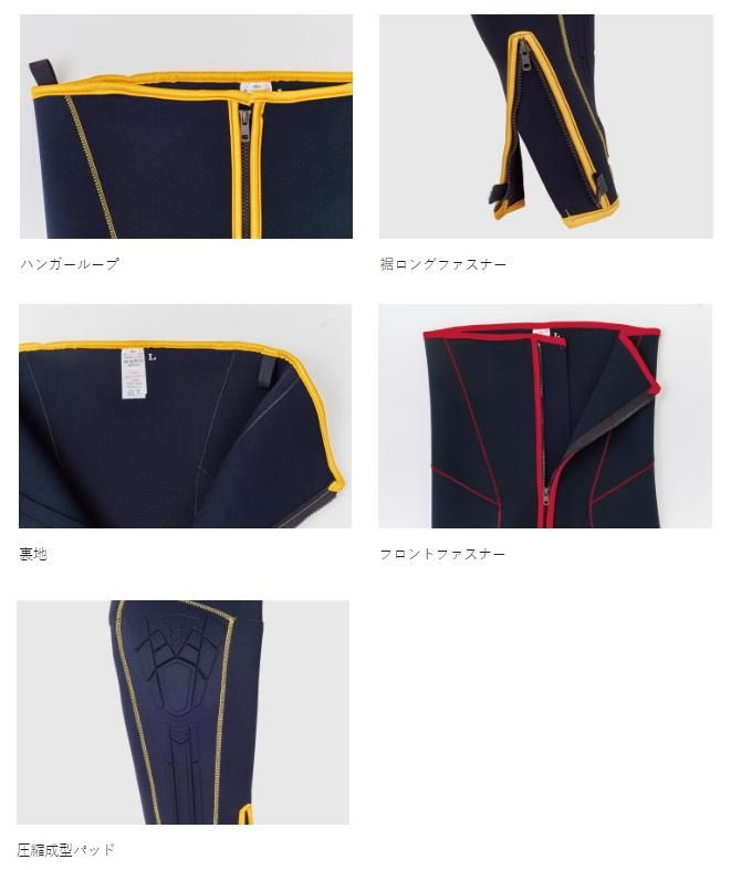 ● 本体には伸縮性の違う2種のクロロプレンを採用し、身体へのフィットは抜群。新立体裁断を合わせることによりワンランク上の機動性を実現。