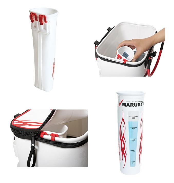 計量機能を兼ね備えたヒシャクスタンド。計量線付きのクリア窓を大きく設計することで、エサ作りに必要な水量が計りやすくなりました(1カップ目安は700cc、水量線は500ccまで配置)。背面にはマルキユーオリジナルフックを採用することで、バッカンへの装着が簡単。ぐらつきが少なく、安定感が向上しました。バッカン内側へのセット時には、取り付けた状態でファスナーの開閉が可能です。