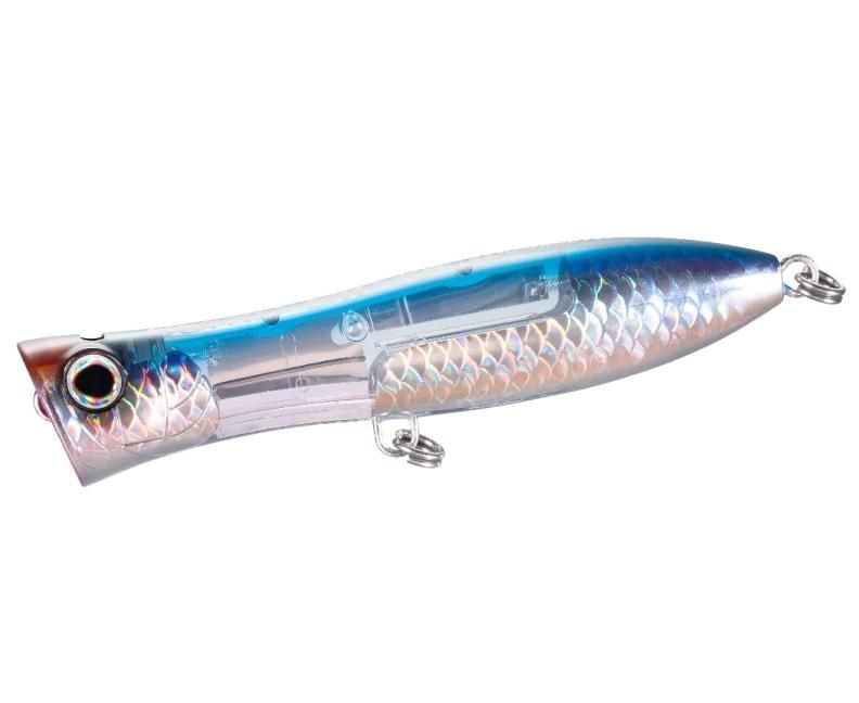 潮噛みが良く、移動距離の少ないポッピングを実現できるひょうたん型ボディ。水に絡みやすいので水面をルアーが転がってしまうようなミスアクション低減も狙っています。大音量ポッピングで注目を引き、喰わせやすい小型ボディに加えて、ルアーアクションが止まっている問もフラッシングを続けるフラッシュブーストを搭載。
