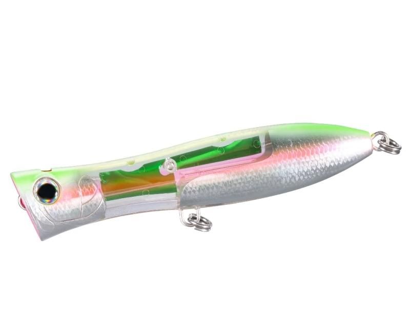 潮噛みが良く、移動距離の少ないポッピングを実現できるひょうたん型ボディ。水に絡みやすいので水面をルアーが転がってしまうようなミスアクション低減も狙っています。大音量ポッピングで注目を引き、喰わせやすい小型ボディに加えて、ルアーアクションが止まっている問もフラッシングを続けるフラッシュブーストを搭載。