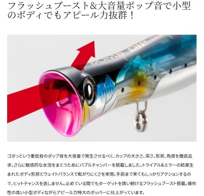 潮噛みが良く、移動距離の少ないポッピングを実現できるひょうたん型ボディ。水に絡みやすいので水面をルアーが転がってしまうようなミスアクション低減も狙っています。大音量ポッピングで注目を引き、喰わせやすい小型ボディに加えて、ルアーアクションが止まっている問もフラッシングを続けるフラッシュブーストを搭載。