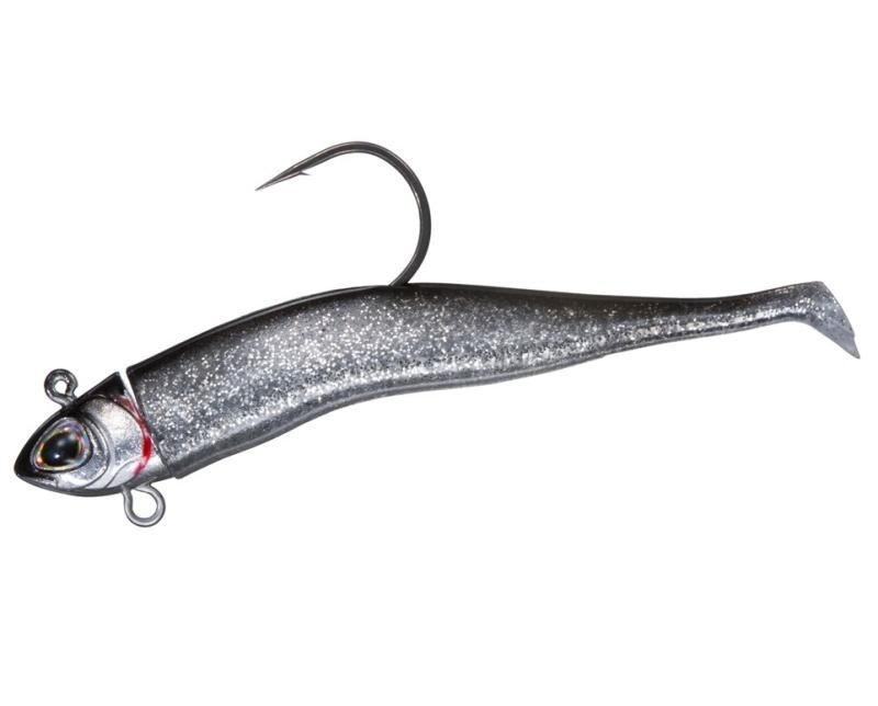 三角断面ブーメランボディ形状&極小テール採用により、タダ巻きでは小魚のような波動を発生、ジャークでは左右に大きくダートさせるワインド釣法にも対応。スローリトリーブでは、水鳥の足ヒレ形状からヒントを得たダックフィン極小テールが微振動するだけのアクションを演出。ファストリトリーブではブーメラン形状のワーム後半部が水流でうねりながらバイブレーションし、まるで必死に逃げる小魚のような波動を発生。ワーム部を中央でへの字に曲げることで、ジャークアクションによるワインド釣法では左右に大きく安定してダートし、リアクションバイトを誘発。ジグヘッド腹部には、トレブルフックも搭載可能なアイを設置。食い渋りに強いベイトフィッシュそっくりのリアルシェイプデザイン。