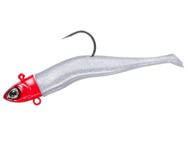 三角断面ブーメランボディ形状&極小テール採用により、タダ巻きでは小魚のような波動を発生、ジャークでは左右に大きくダートさせるワインド釣法にも対応。スローリトリーブでは、水鳥の足ヒレ形状からヒントを得たダックフィン極小テールが微振動するだけのアクションを演出。ファストリトリーブではブーメラン形状のワーム後半部が水流でうねりながらバイブレーションし、まるで必死に逃げる小魚のような波動を発生。ワーム部を中央でへの字に曲げることで、ジャークアクションによるワインド釣法では左右に大きく安定してダートし、リアクションバイトを誘発。ジグヘッド腹部には、トレブルフックも搭載可能なアイを設置。食い渋りに強いベイトフィッシュそっくりのリアルシェイプデザイン。