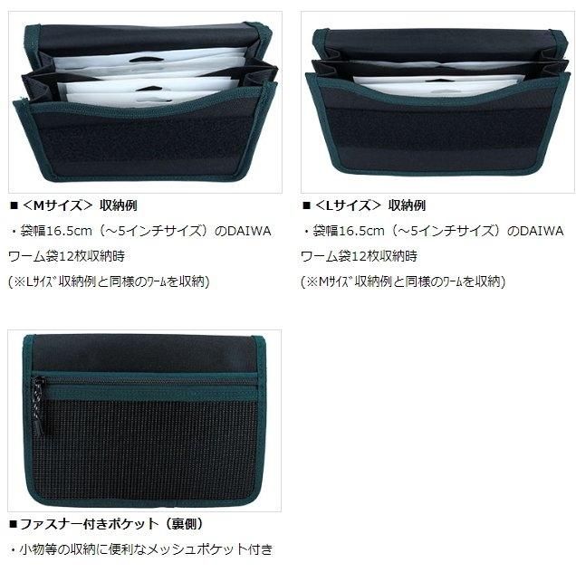 Mサイズ:袋幅16.5cm(〜5インチサイズ)までのDAIWAワーム袋を12枚程度収納可能