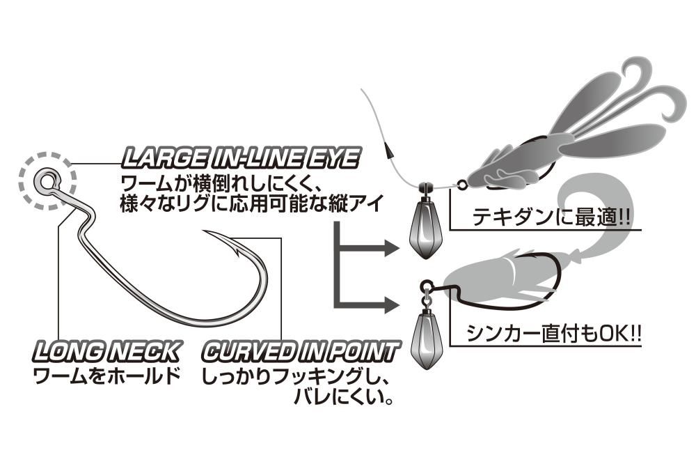 スプリットリング&ダウンショットシンカー等を直接続でき、簡単にリーダーレスダウンショットを組む事ができる「ワイドなタテアイ」が斬新なロックフィッシュゲーム対応オフセットフック。シャンクが常に下側に安定しやすく、水中でのワームの上下を確実にアングラーの意図通り向かわせるタテアイフックの特長と、ワイドアイの長所を融合。シンカーフリーとなるテキダンやテキサスリグにもその性能を発揮。#4〜#3/0までのサイズラインナップが追加となり、さらに幅広い根魚をロックします。