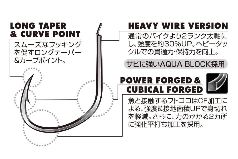 ライトジギングフックのグローバルスタンダードと言える「AS-03 パイク」を太軸化し強度をアップ。パイクが持つ掛かりの良さや扱いやすさを継承しつつ、さらなる大物狙いに対応した強化版です。