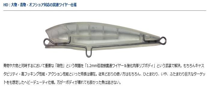リアルなベイトフィッシュライクな外観、秀逸なキャスタビリティ、多彩なアクション。そして何よりもその長年の実績から「これはエサだ」とまで称えられる珠玉のペンシルベイト「T.D.ソルトペンシル」の基本性能、リアルなシルエットはほぼそのままに継承。リアルスリムボディによる高いフッキング性能、弱ったベイトフィッシュを演出する独特の浮き姿勢から生まれる軽快なドッグウォークアクション、そしておちょぼ口と元祖ウォータースルーギル構造による甘いスプラッシュ&ポップサウンドはあらゆるフィッシュイーターを魅了する。強化ボディの「HD(HEAVY DUTY)」を含めた多彩なサイズ展開により、シーバスはもちろんメッキやカマス、クロダイ等のライトゲームからシイラや青物まで対応。