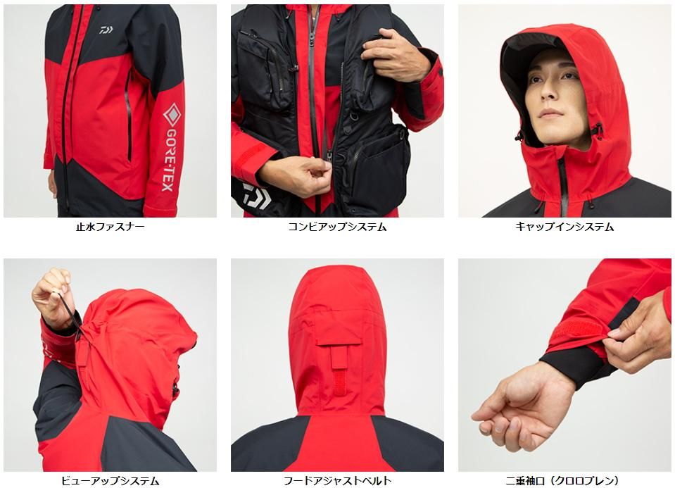 しなやかさと透湿防水性能を兼ね備えるゴアテックスファブリクス2層素材を使用。磯釣りに適した厚みのある生地を使用。 磯釣りに便利な機能を搭載。 対応キャップと接続できるキャップインシステムで、フードの垂れ下がりを防ぐ。ウェアと磯用フローティングベストとの一体化を可能にするコンビアップシステムは、足元の視界を確保でき安全性も向上。 コマセを撒く動作を想定して、パンツはずり落ちなく快適に行動可能なサスペンダー仕様。タオルなどをかけられるパンツサイドループつき。