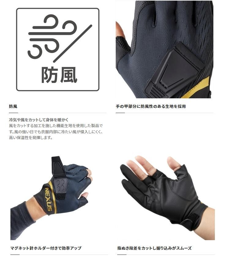手の甲に防風性のある生地を採用した磯用グローブです。ハリスを滑らせ針を掴む動作を想定してレザーの配置を見直し、さらに針を収納できるマグネットホルダーを搭載させました。操作性と保温性のバランスのよい3本指抜きタイプです。